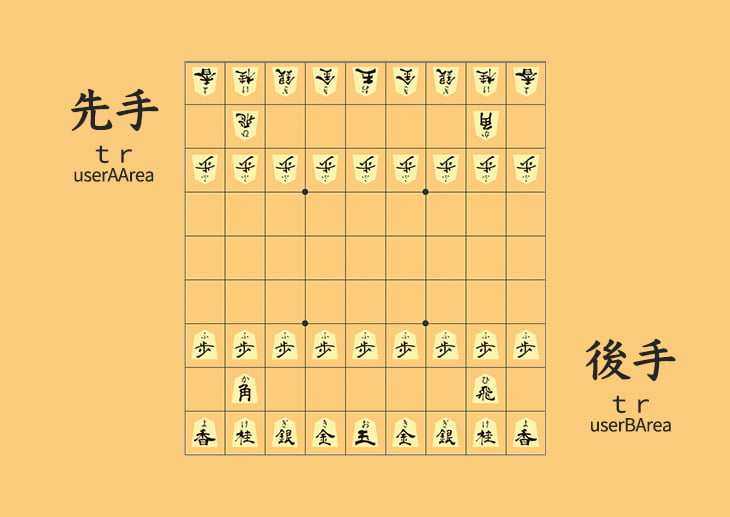 将棋のボードは9マス×9マスのグリッドです。マスの中に駒が一個ずつ並びます。