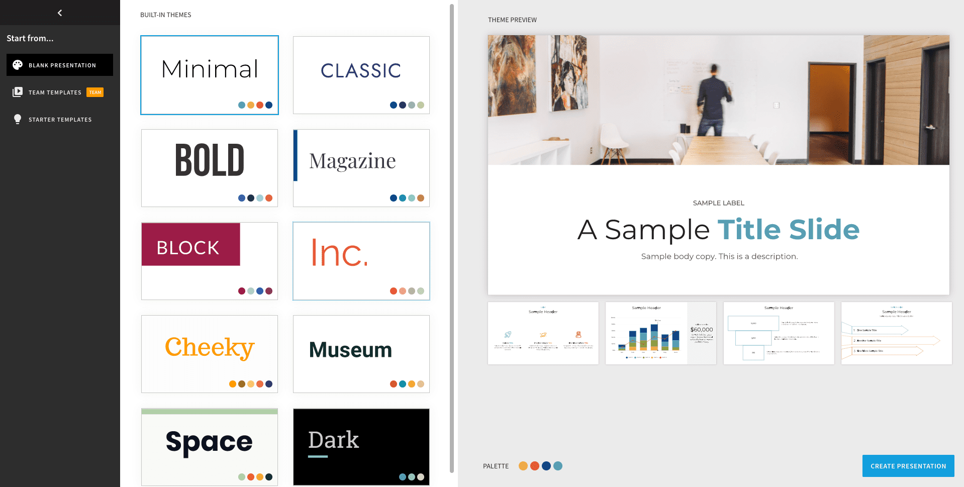「CREATE NEW PRESENTATION」をクリックするとテンプレートスライドのテーマが出てきます。