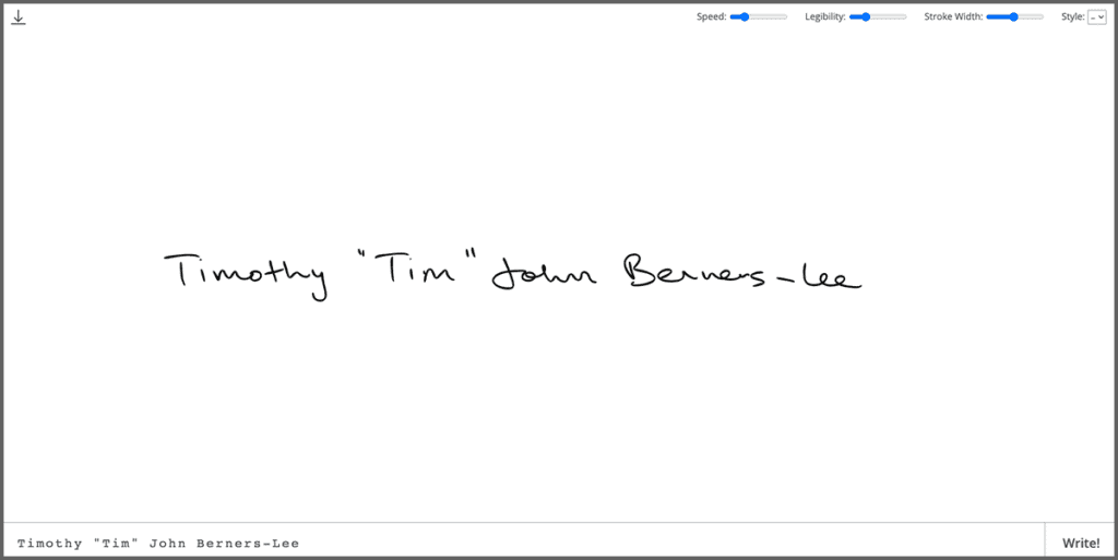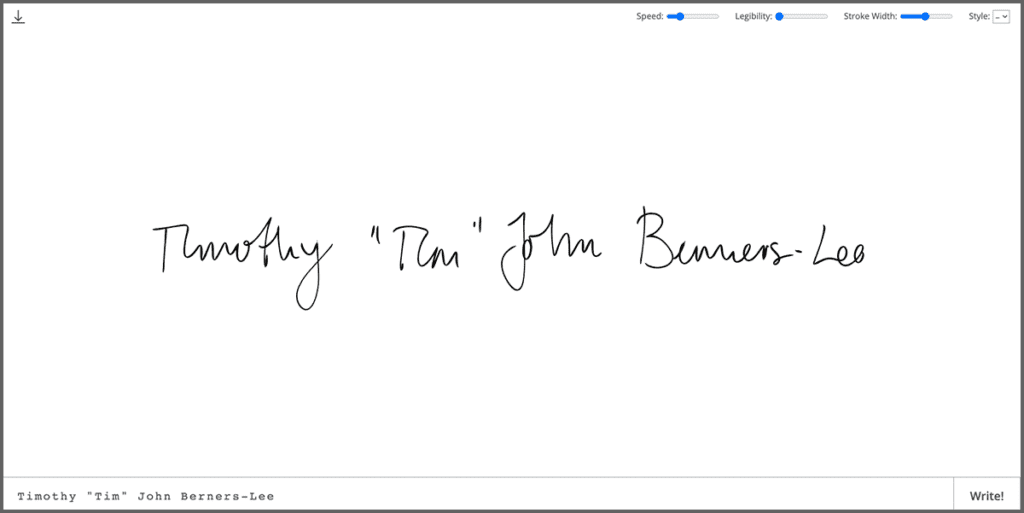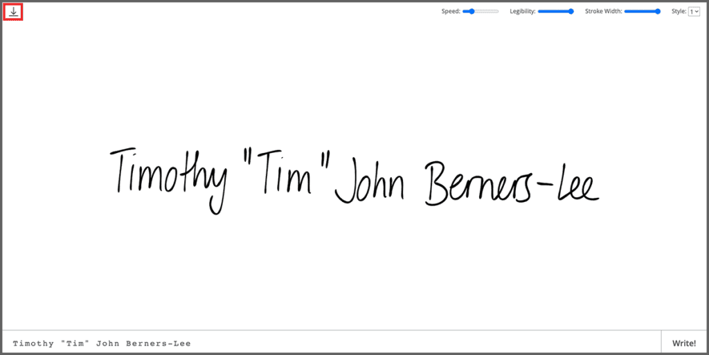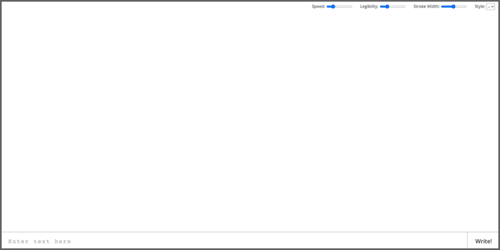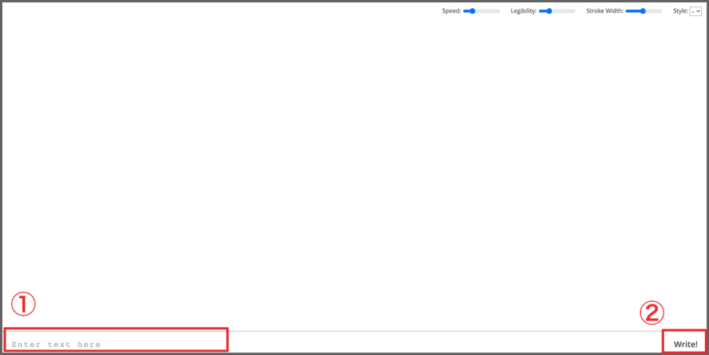 操作方法も本当にシンプルで、以下画像の①へ任意の英字テキストを入力し、②の「Write!」を押すだけで完成です。