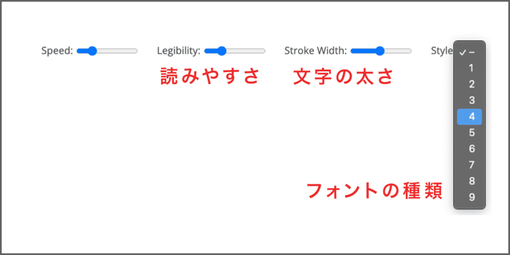 右上のバーで読みやすさ(筆記体の強弱)や、文字の太さなど色々調節が可能になっています。