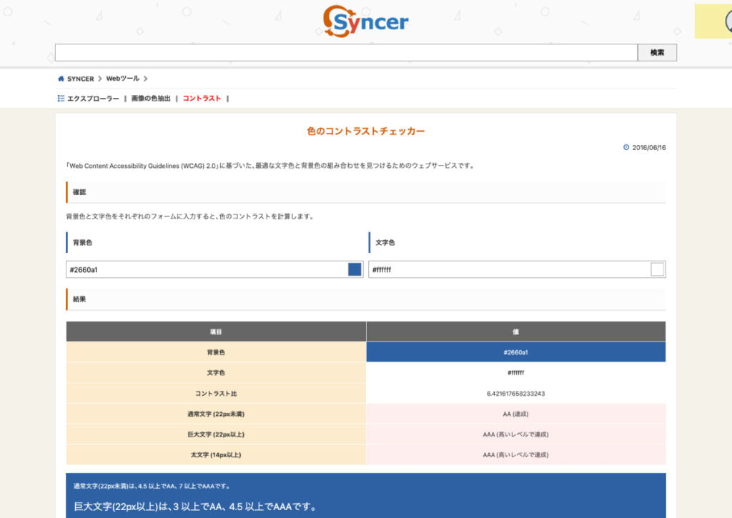 このサイトは、WCAG2.0に基づいた、コントラスト比を確認できるウェブサービスです。