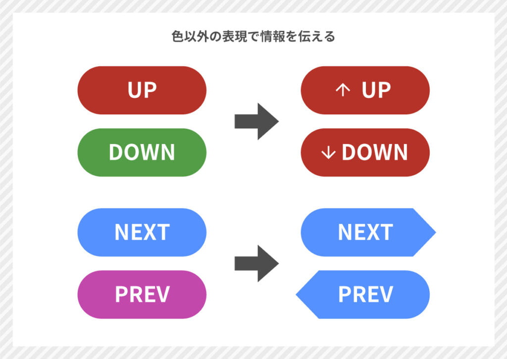 色だけを頼りに情報や動作を促すような表現は避け、テキストや記号、形などを併せて情報を伝えるようにする。
