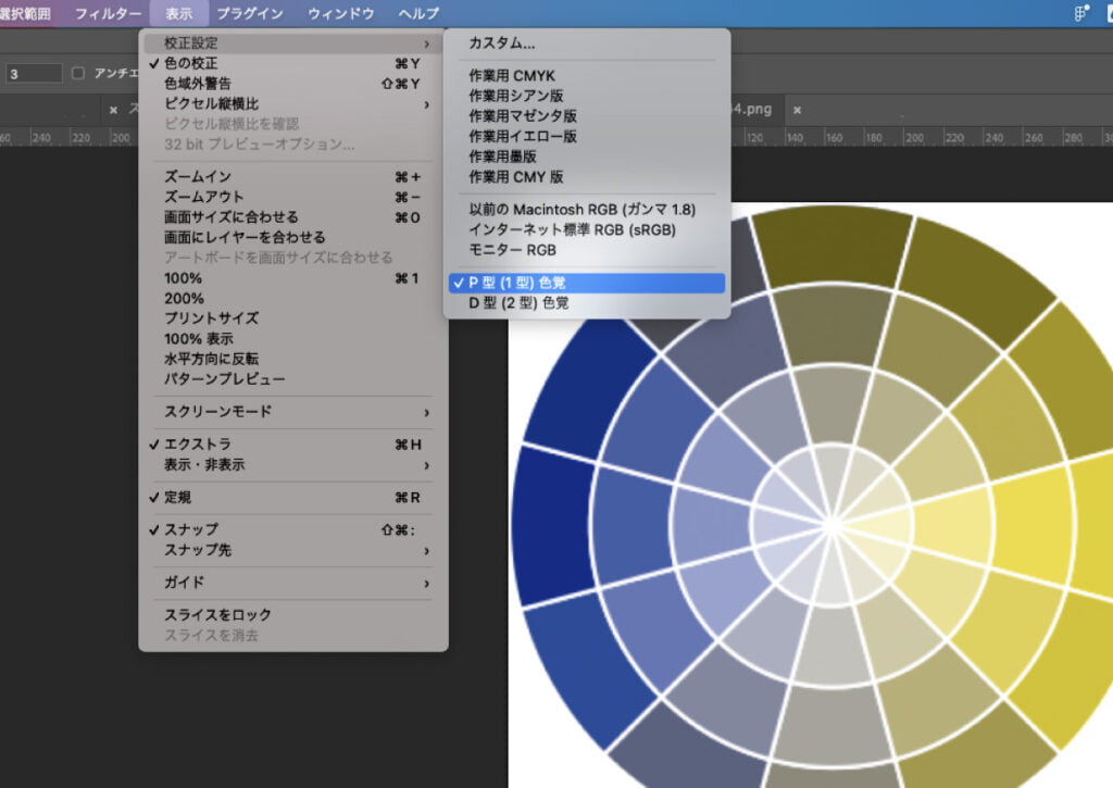 「表示」→「校正設定」で、フォトショでも色の見え方の確認ができます。