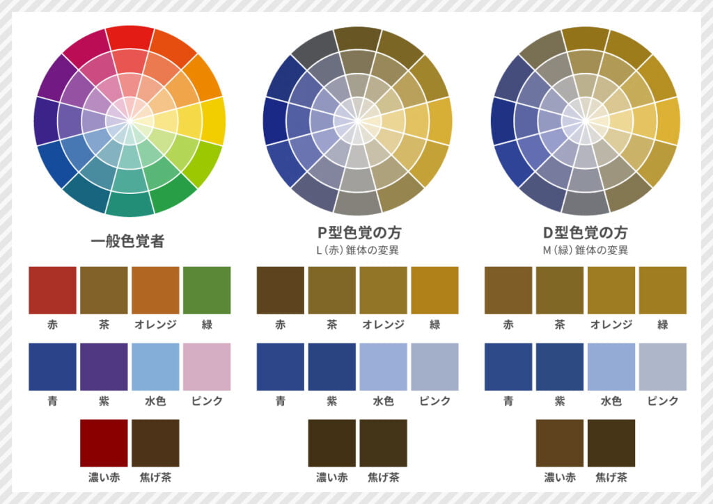 このように誰もが同じ見え方ではないということを念頭に置き、配色を考える必要があり、そのためにはまず様々な見え方を理解して、デザインを工夫する必要があります。