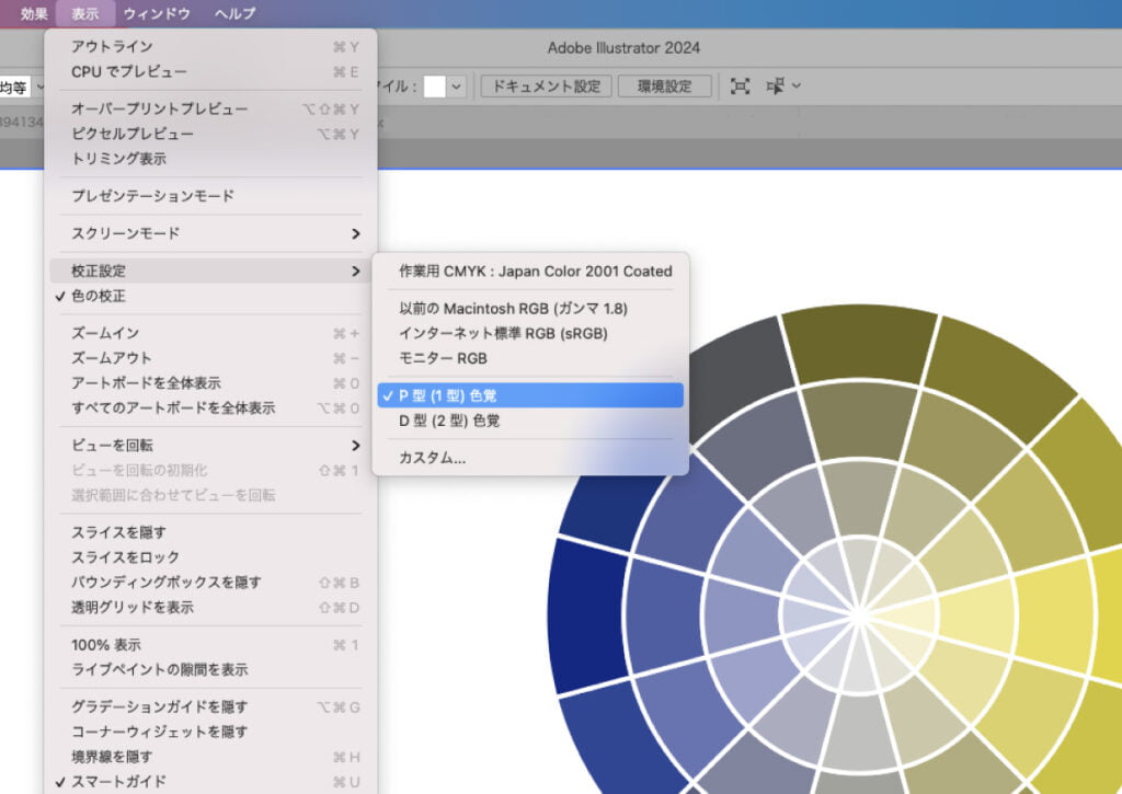 「表示」→「校正設定」で、イラレでも色の見え方の確認ができます。