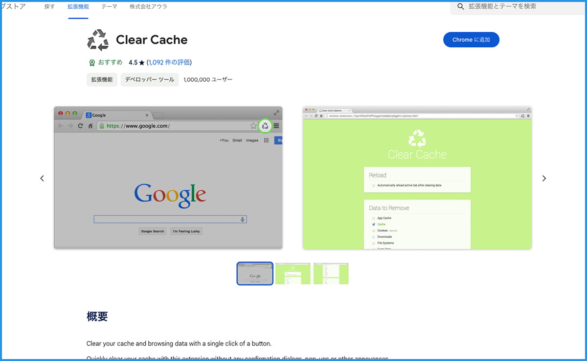使い方は本当に簡単です。まず設定方法ですが「Clear Cache」拡張機能からchromeへ追加ボタンを押して追加してください。