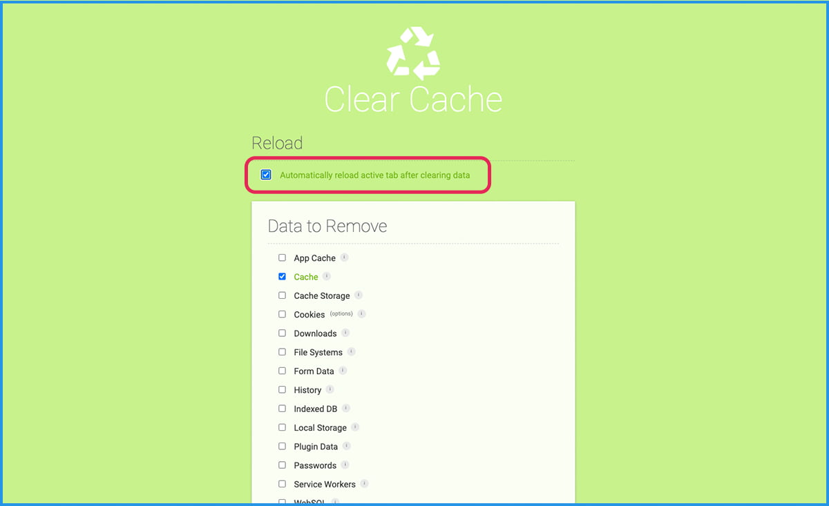 そうするとClear Cacheのページが出てくると思うので、「Automatically reload active tab after clearing data」にチェックを入れてください。これで設定は完了です。