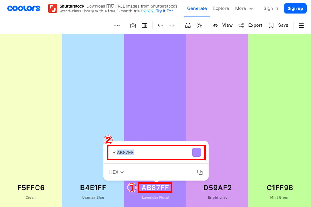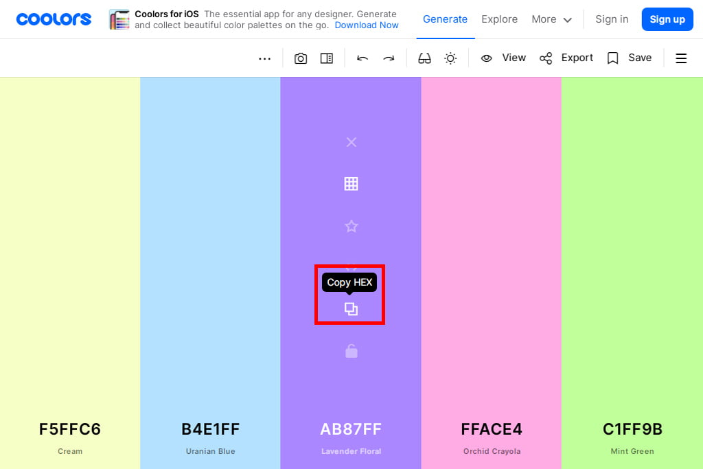 好きな色をマウスオーバーすると、アイコンが表示されます。その中のCopy HEXアイコンをクリックすると、カラーコードがコピーされるので、必要な場所にペーストしてください。