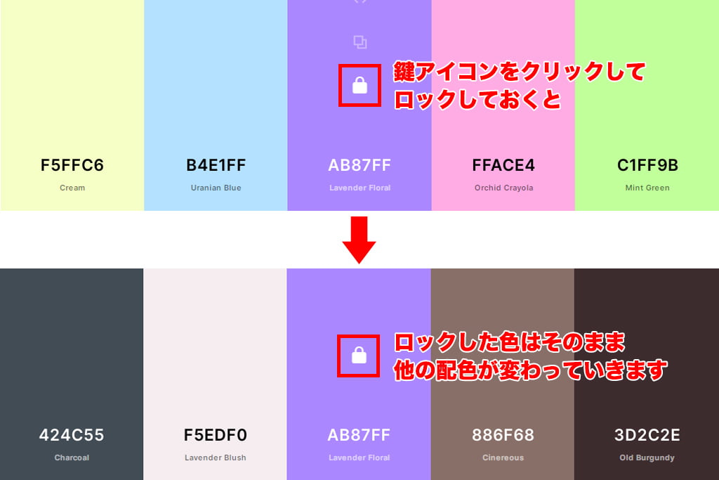 そんな時は、一番下の鍵のアイコンをクリックすると、その色がロックされて、他のパレットの色が入れ替わっていきます。