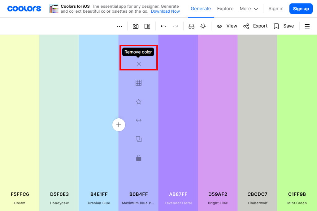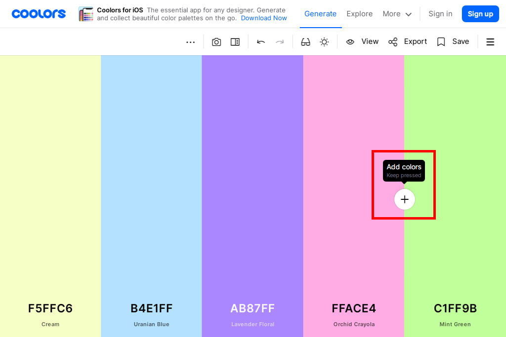色同士の境目をマウスオーバーすると+(Add colors)アイコンが表示されるので、クリックすると現在のパレットの配色に合うカラーが追加されます。最大で10個まで増やすことが可能です。