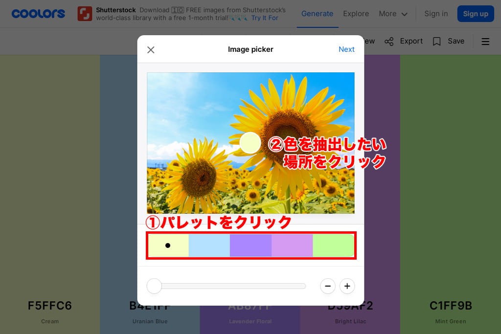 現在のパレットが表示されているので、それぞれの欄をクリックして切り替えながら、画像内の色を抽出したい箇所をクリックします。