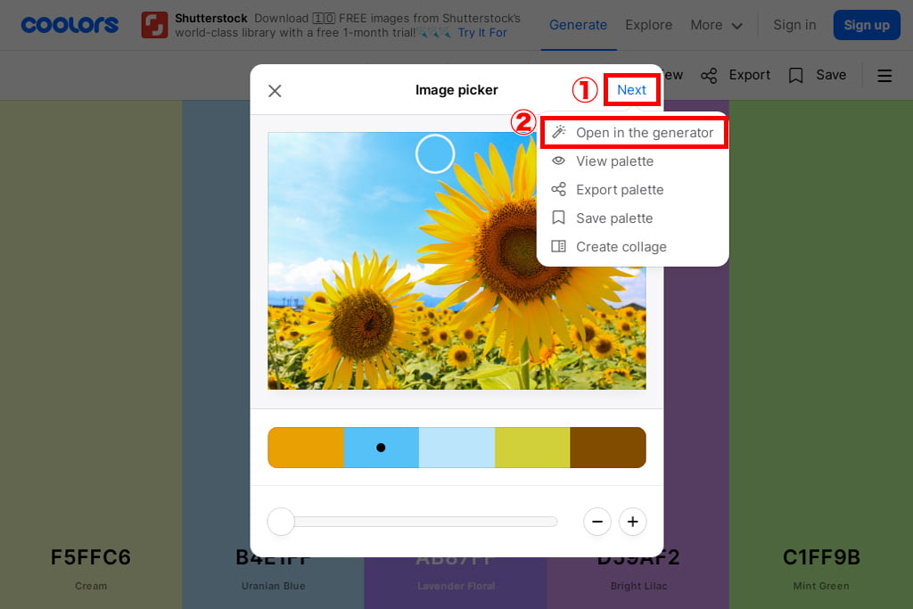 色の抽出が完了したら、Next→Open in the generatorをクリックします。