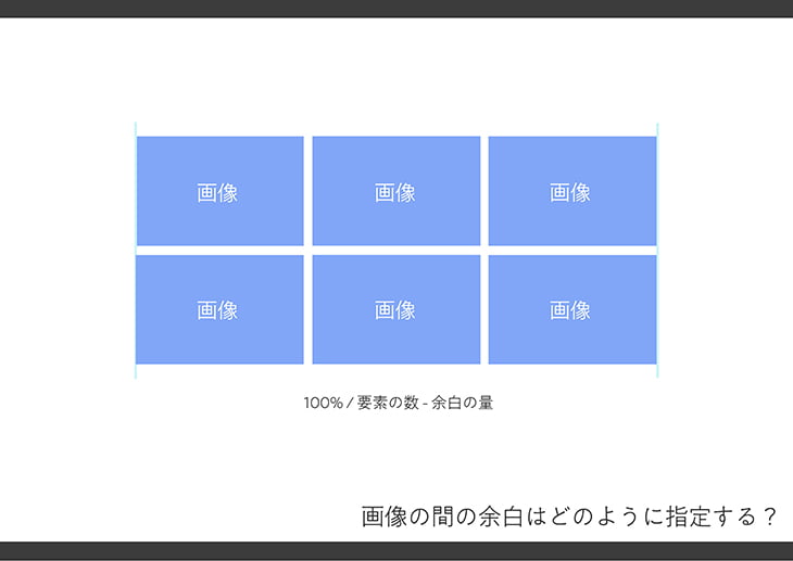 また、要素の幅は、「(100%/並ぶ要素の数)-左余白の幅」という計算式を与えます。