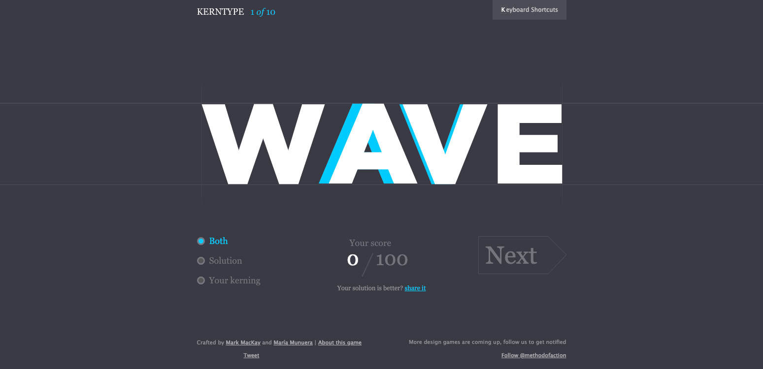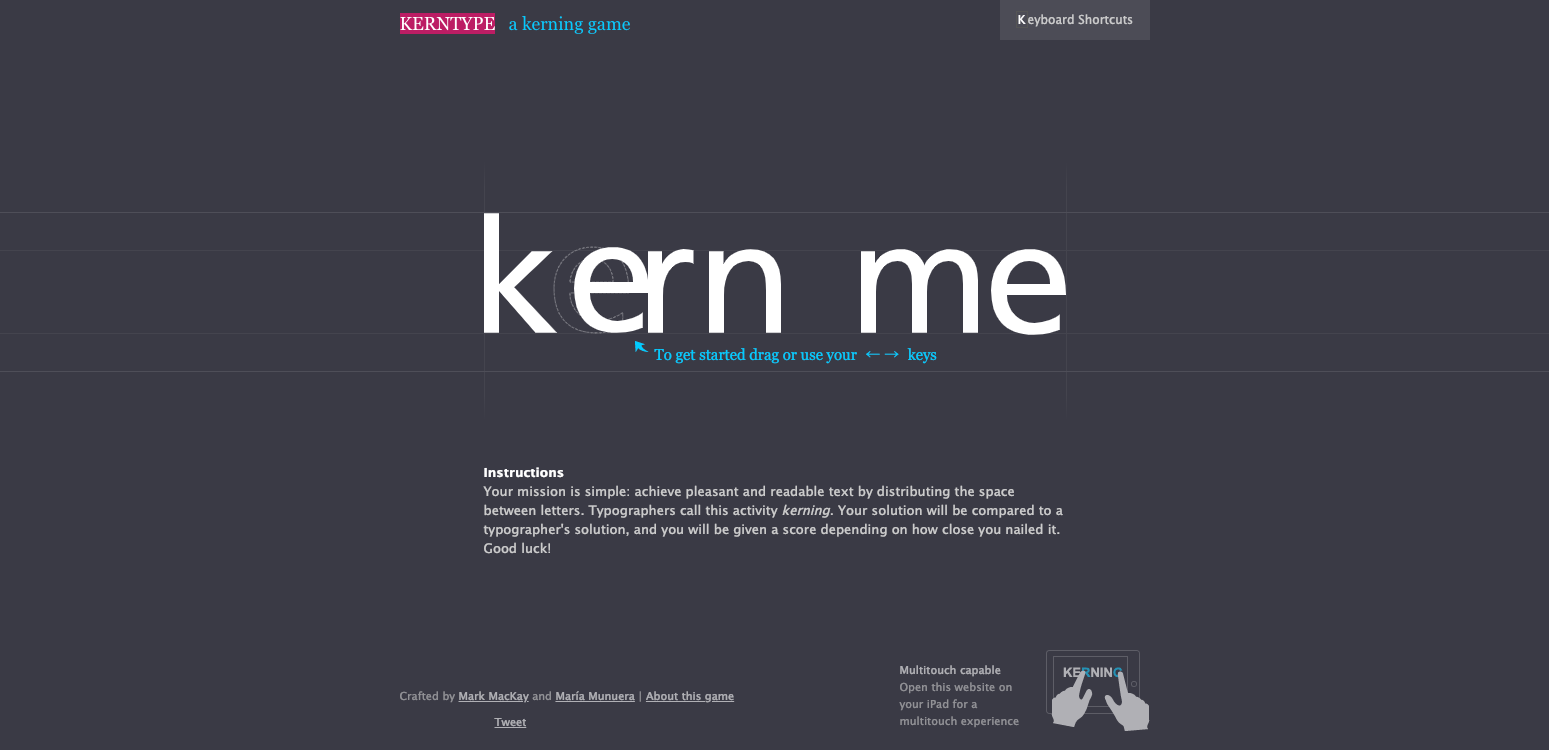 最初の「kern me」はチュートリアルで、”e”のアルファベットを点線に合わせると正解になります。