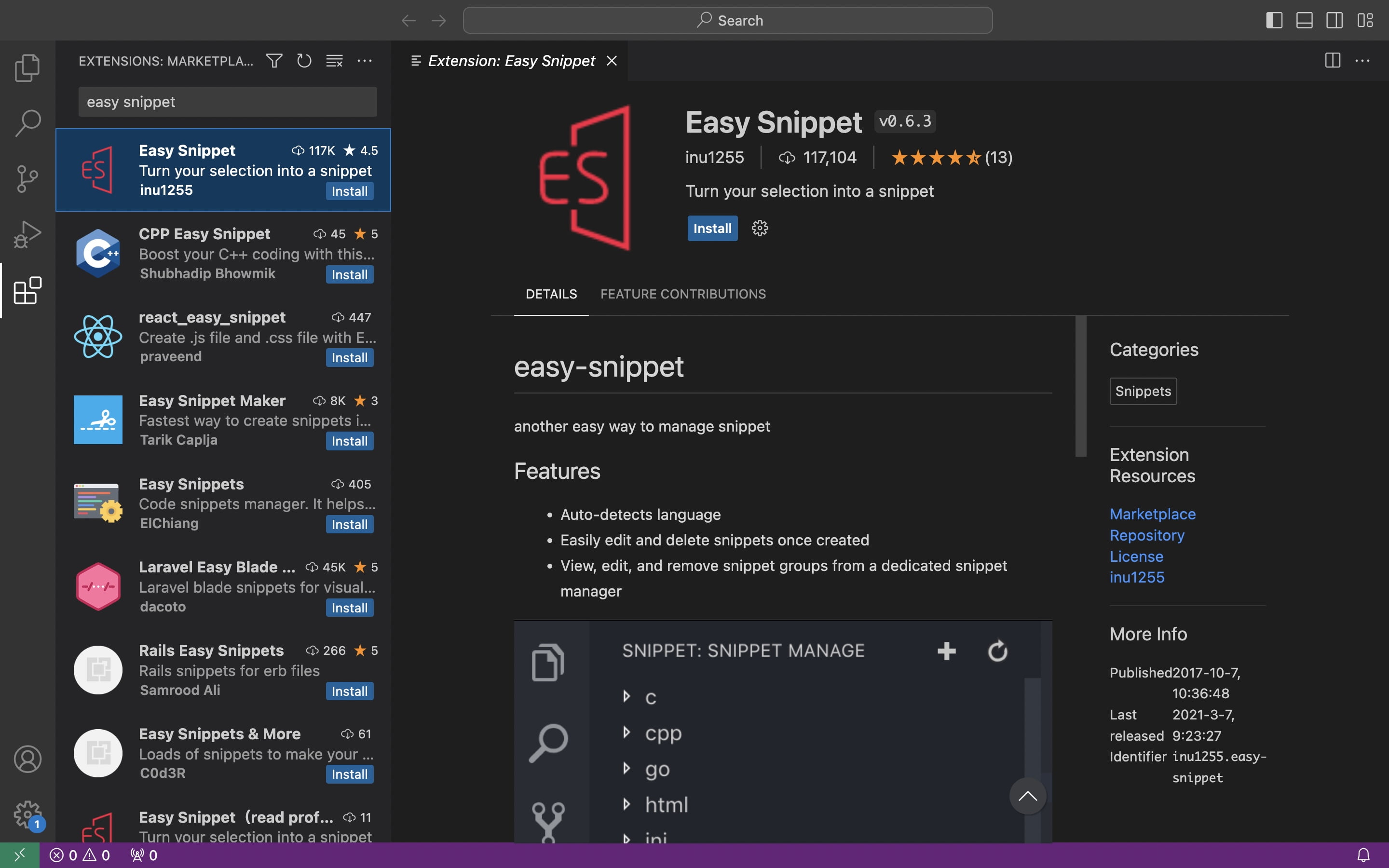 VSCODEの拡張機能から「Easy Snippet」を検索しインストールします。