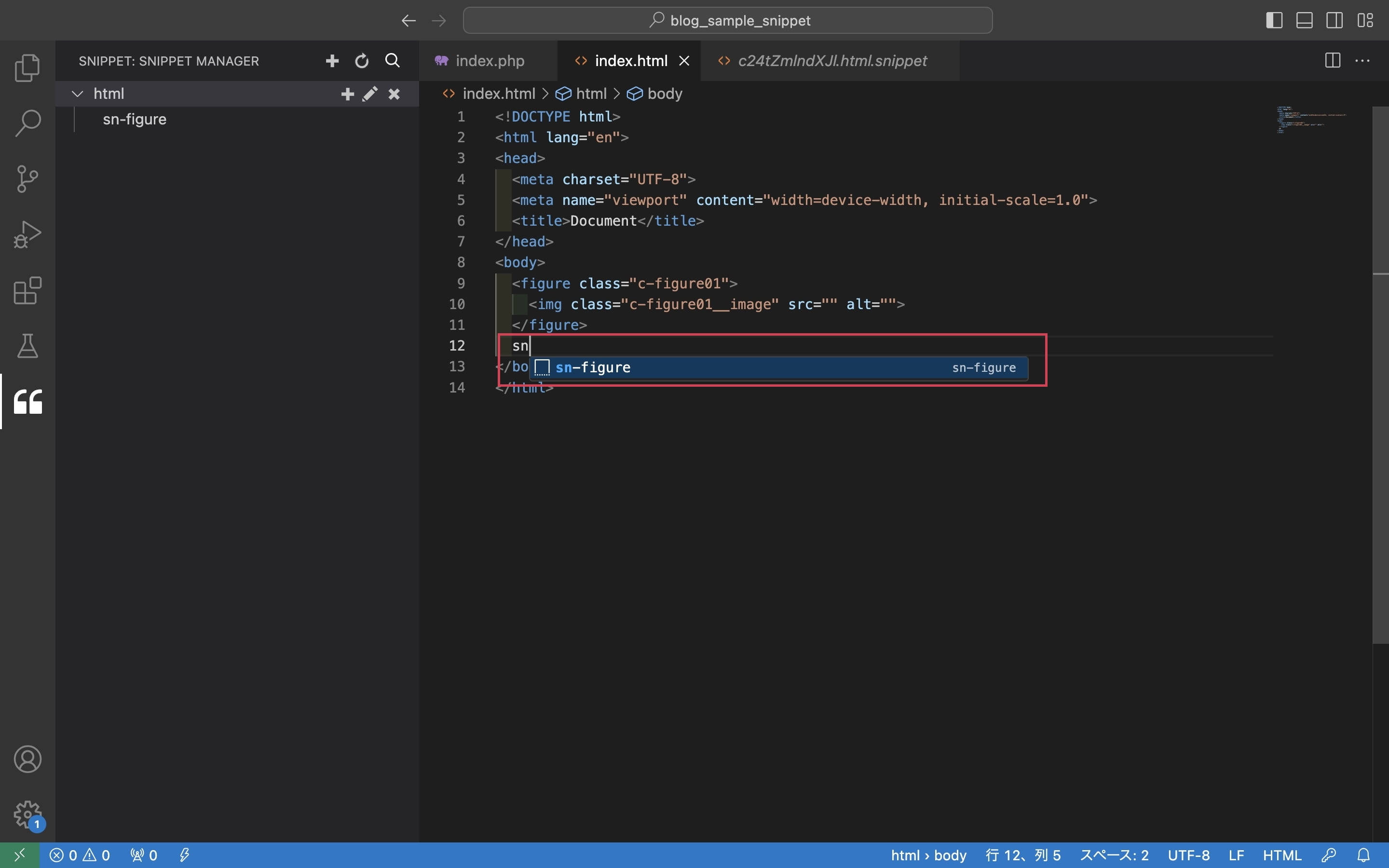 コードを呼び出したいファイルでスニペット登録時に設定した名前を入力すると候補として表示されますので選択することで、