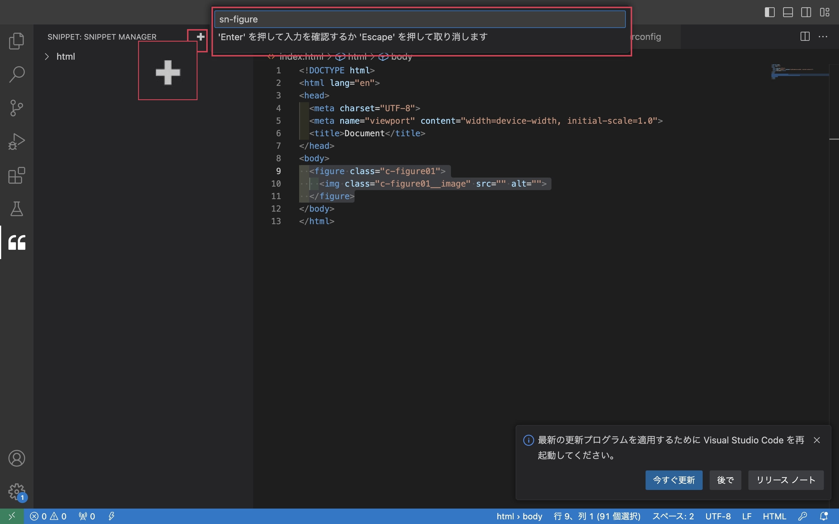 スニペットに登録したいコード・テキストを選択しプラグイン右上の「+」をクリックし、