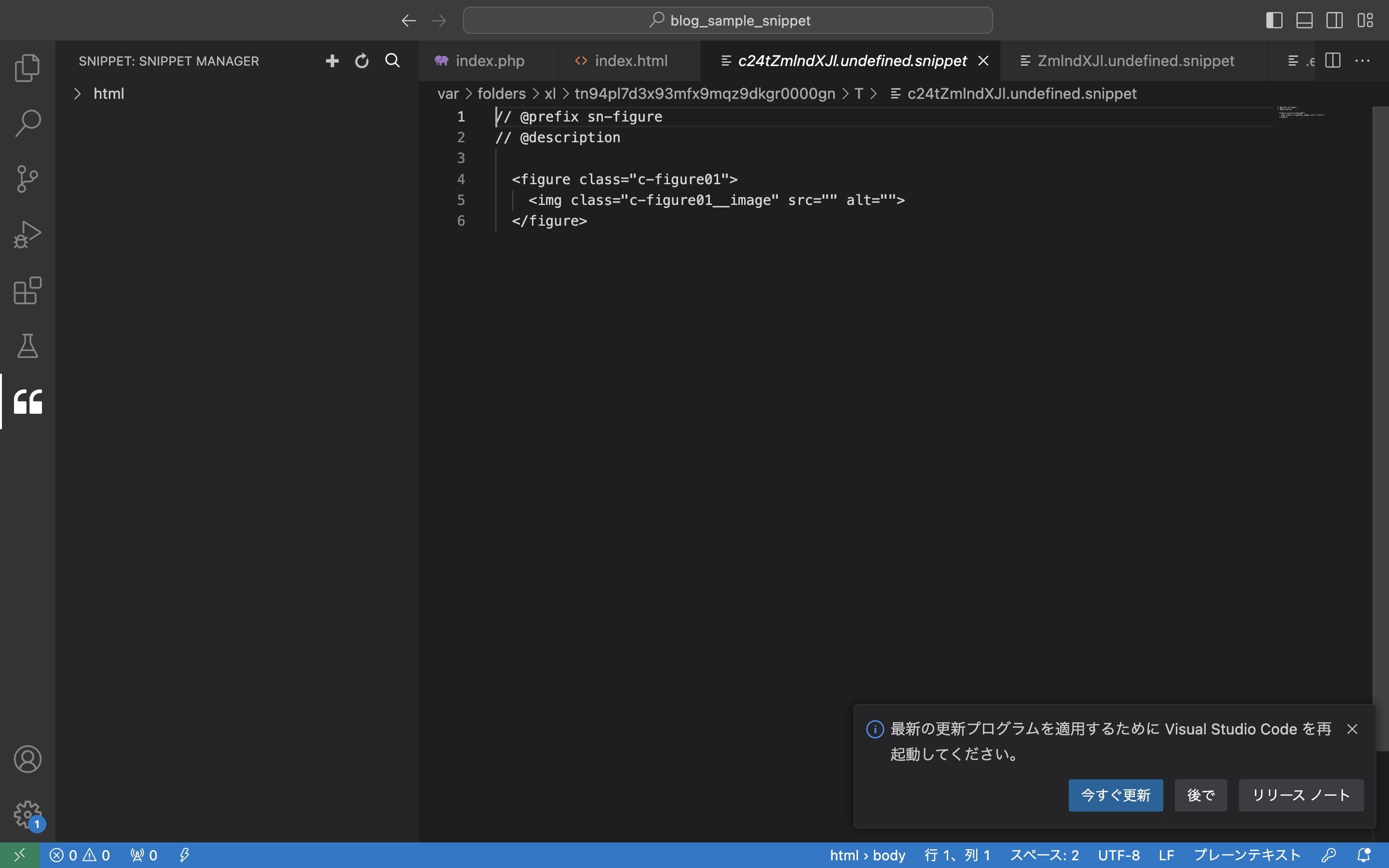 先ほど選択したコードで問題なければファイルを閉じてスニペットの登録完了です。