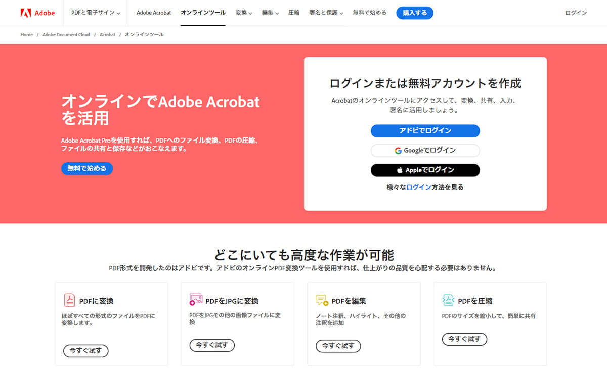 Acrobat オンラインツールは、Acrobatのアプリで使えていた機能の多くを、オンライン上で使えるツールです。