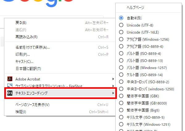 こちらをインストールしておくと、Google Chrome上で右クリックした際、メニューに「テキストエンコーディング」という項目が追加されます。