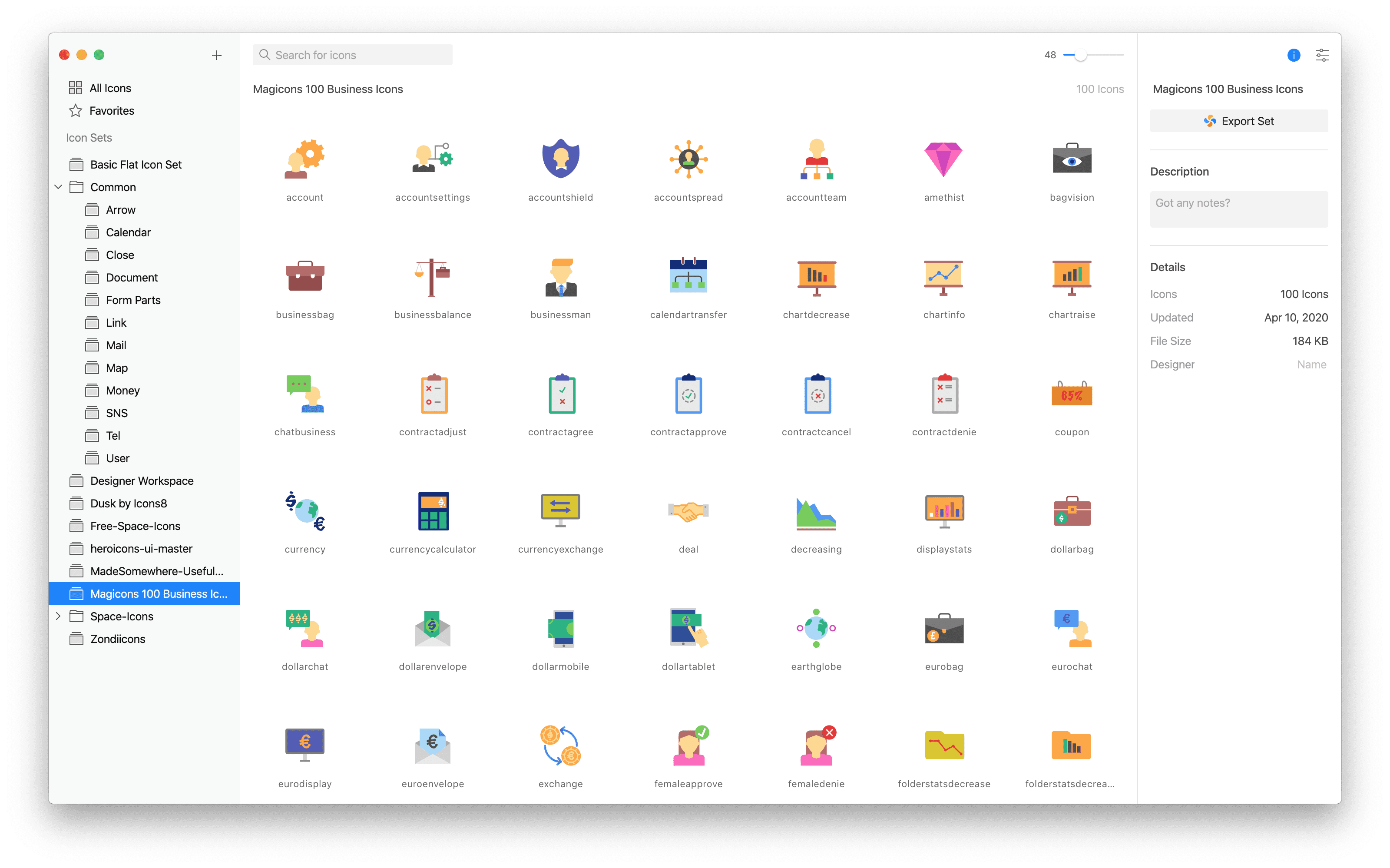 アイコンは左サイドのカテゴリーごとに管理することができ、ディティールが似た物同士のアイコンや、アイコンのセットなどグループごとに管理ができるので、使いたいアイコンが探しやすいです。