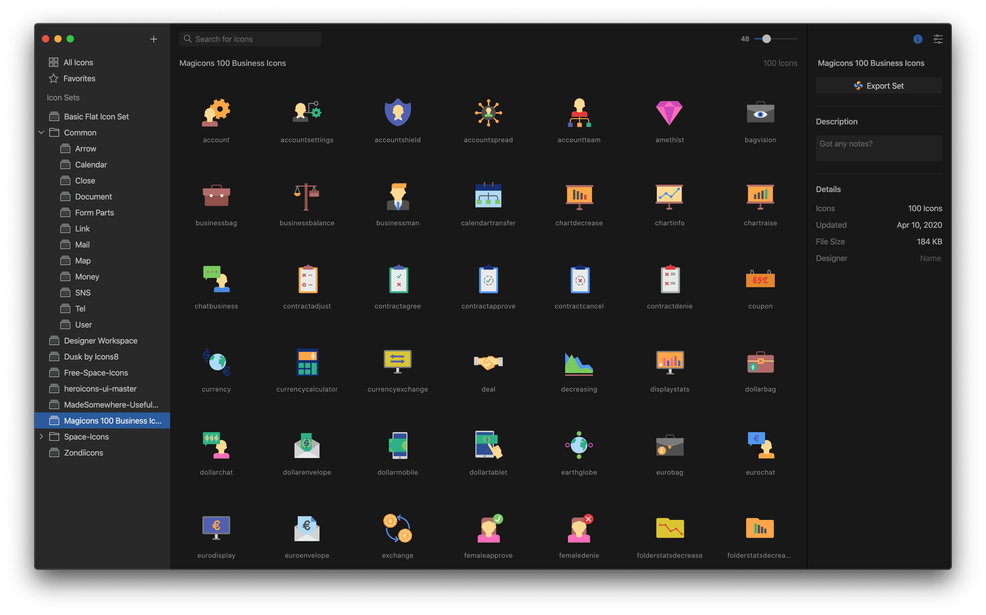 アイコンはカテゴライズしたセット単位で書き出しができるので、チーム間でアイコンデータのやり取りも楽になりそうです。