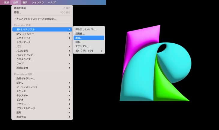 メニューバーの「効果」→「3Dとマテリアル」→「膨張」を選択します。
