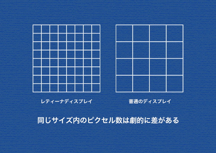 「レティーナディスプレイ」と呼ばれる高画質のモニターも、昔より光る正方形を多く持つことでより繊細に表現できるようになります。