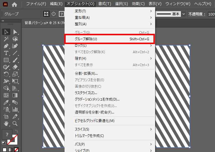 再びメニューのオブジェクトから、今度はグループ解除をクリックします。