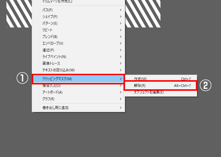 必要箇所を選択しやすいので、メニューのオブジェクトから、クリッピングマスクの解除もしておいた方が良いです。