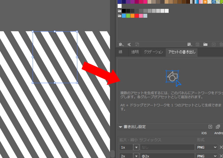 Web素材として書き出すべく、アセットの書き出し欄にドラッグしてみると…