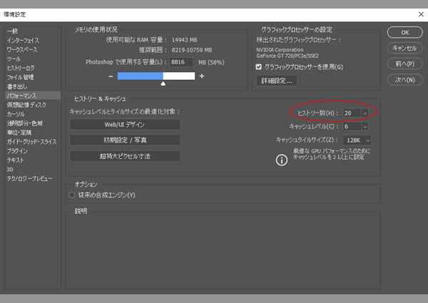 回数は「環境設定 → パフォーマンス → ヒストリーの数」で設定している分だけ戻れるようです。