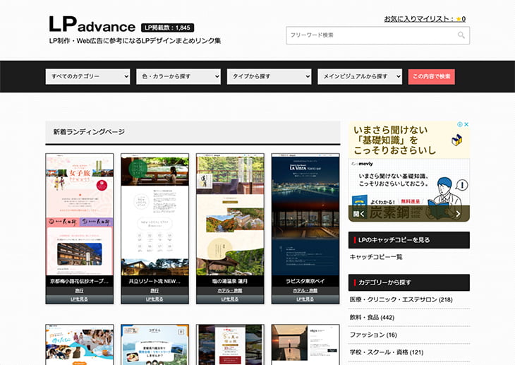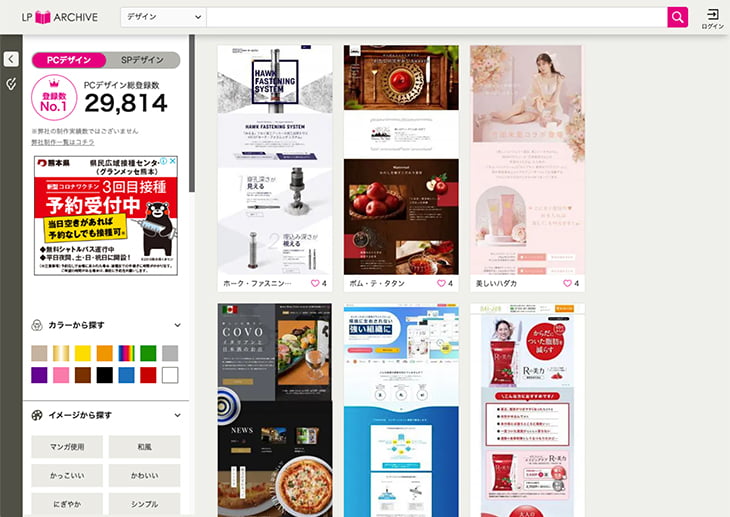 こちらも日本国内のLPを集めたサイトでサムネイルが縦長に表示されています。検索のしやすさが便利です。