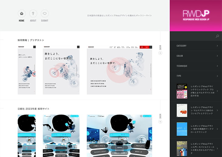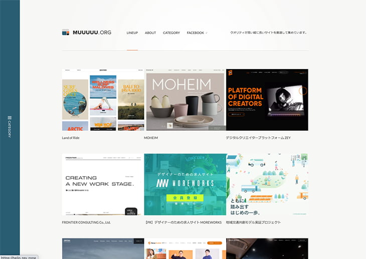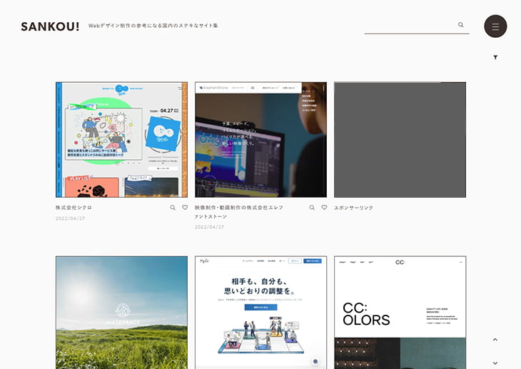 日本サイトと海外のサイトも掲載されているサイトです。デザインのクオリティーが高いサイトが多く紹介されているため、オートドックスではないデザインを考える際にはとても参考になります。こちらも細かくカテゴリー分けされており、必要な時にすぐに検索できる点が個人的にとても助けてもらっている部分です。