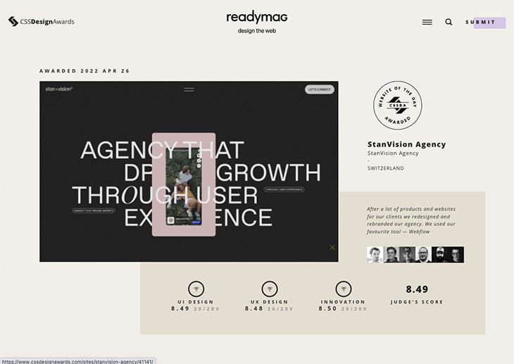 国際的なWebデザイン・開発アワードです。UIデザイン・UXデザイン・イノベーションの3つの基準をもとに世界中の審査委員がWebサイトを評価しています。こちらも世界のトレンドをいち早く知りたい方にはとても参考になるサイトです。