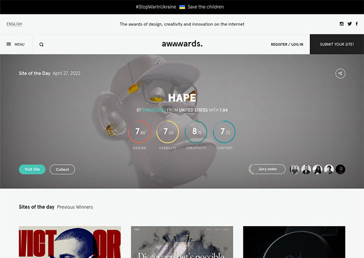 世界一人気があるwebデザインアワード機関です。世界中から投票されたWebサイトを様々な項目で採点・投票を行い、順位付けを行なっています。このサイトを見れば世界の最新のトレンドを知ることができます。