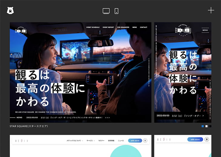 PCとSPのファーストビューが並んで表示されています。サムネイルの表示も大きいため、スマホデザインに悩んだときはこちらのサイトをざっと見るだけでもアイデアの刺激になります。