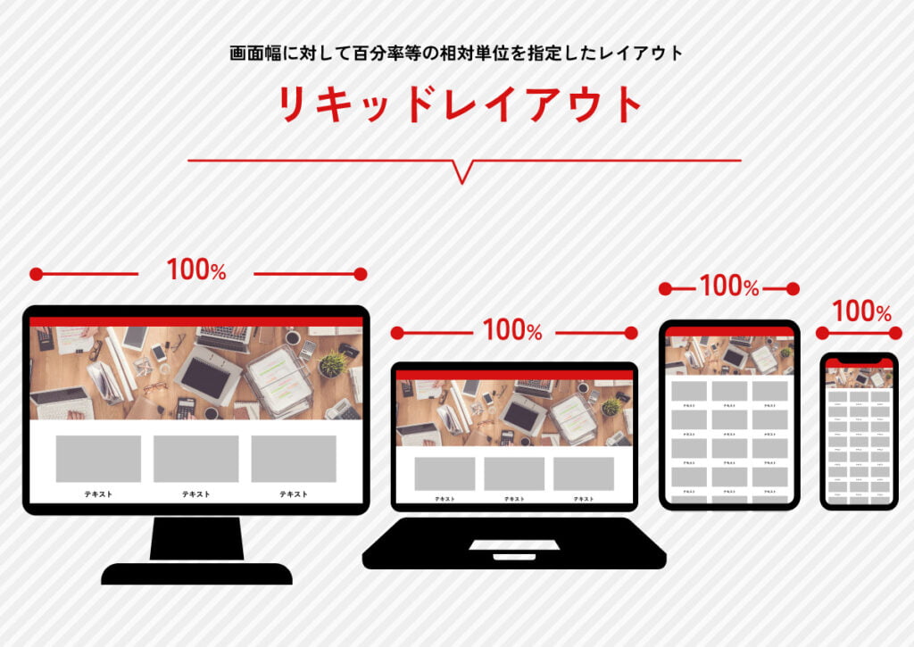 例えば、画面幅に対して100%と指定した場合に、どの形やサイズで閲覧した場合でも同じデザインで表示されます。