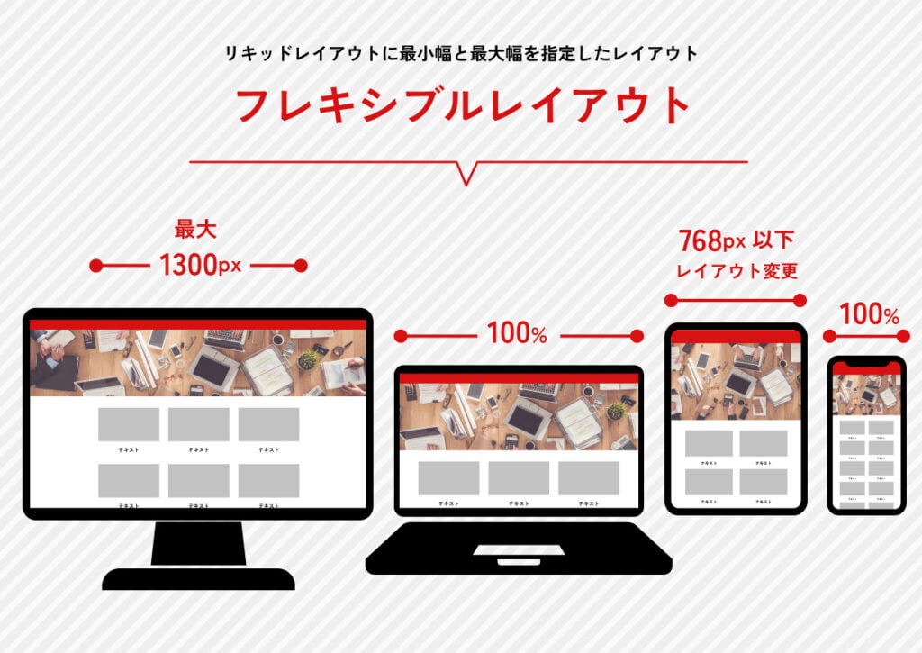 例えば、1300px以下は画面幅に対して100%と指定し、さらに768px以下よりレイアウトを変更することで、それぞれの画面比率に合ったレイアウトで同じデザインで表示することが可能です。