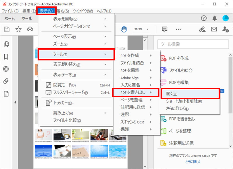 表示→ツール→PDFを書き出し→開く