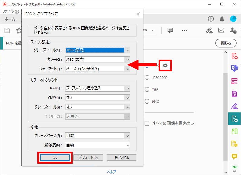 ファイル形式を選択すると、拡張子の右側に歯車のアイコンが出てきました。各ファイル形式ごとに、画質等を調整出来ます。