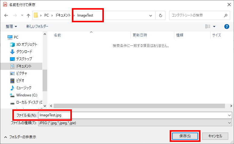 「ドキュメント」フォルダ内に散らからないよう、書き出し用のフォルダ(ここでは「ImageTest」)を作成しました。