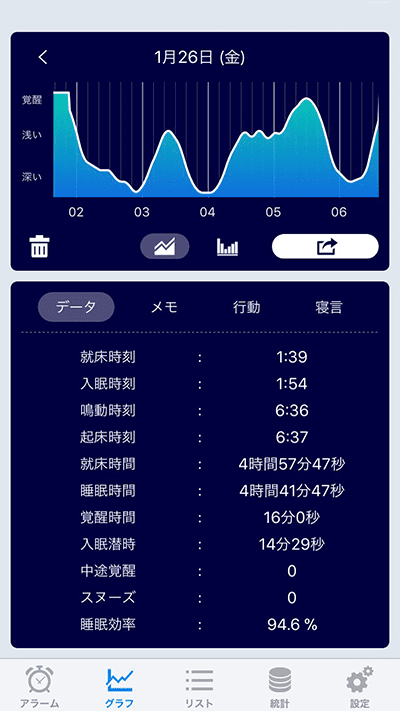朝5時半頃に覚醒に近いところまでグラフが伸びていますが、一瞬時刻を確認した記憶があります(笑)。