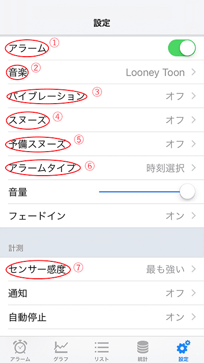 ⑦センサー感度・・・このアプリに特徴である寝ているときのサイクルの感知度。