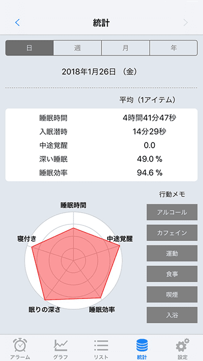 時間ごとの睡眠の深さと、統計よりも更に詳しいデータを見ることができます。