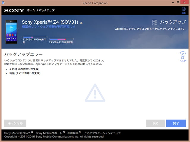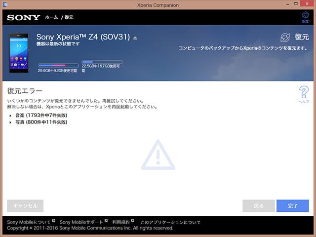 もうここまで来たら、やれること全部試しておこうと、Xperia Companionでバックアップデータを復元してみます。