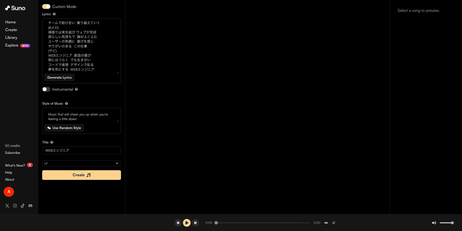 歌詞ができたので、Suno AIを使用して音楽を生成していきます。