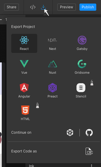 コード化したいフレームorコンポーネントを選択し、右上メニューのダウンロードボタンを押します。