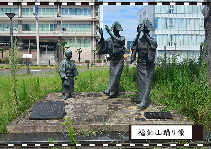 福知山の駅舎も個性があり、福知山城をイメージして設計したそうです。駅前では、当地の文化や歴史を感じる「福知山踊り像」があります。