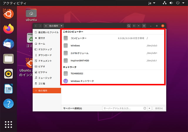 左のアイコン一覧の「ファイル」アイコンをクリックして、「他の場所」をクリックします。